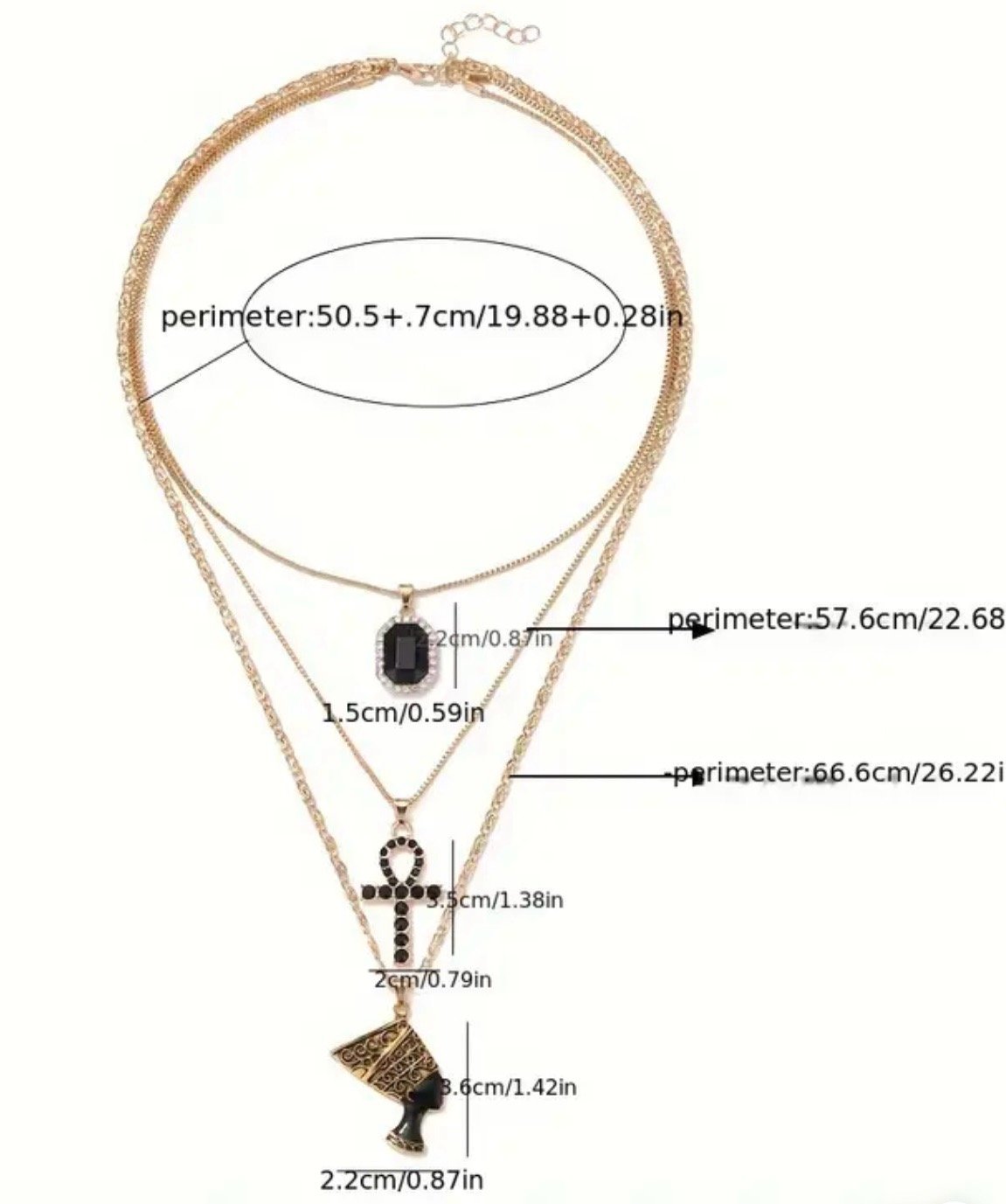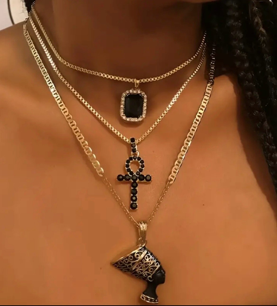 Vintage Multi-Layer Gold Plated Stainless Steel Pharaoh Egyptian Necklace with Black Rhinestones
