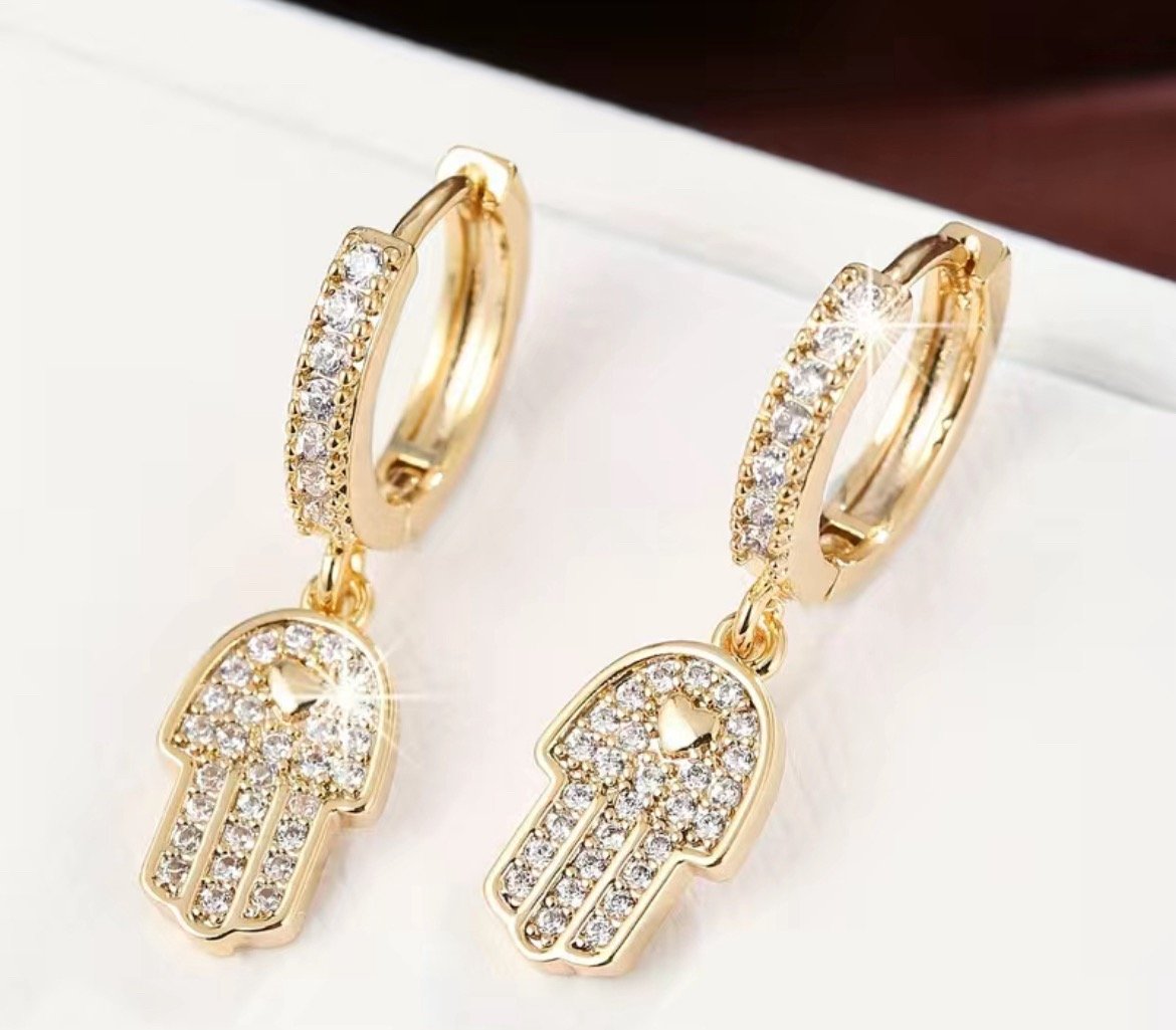 18k Gold Plated Cubic Zirconia Hamsa Hand Drop Earrings