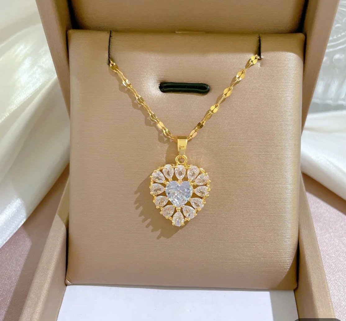 18k Gold Plated Stainless Steel Heart Necklace with Cubic Zirconia Stones