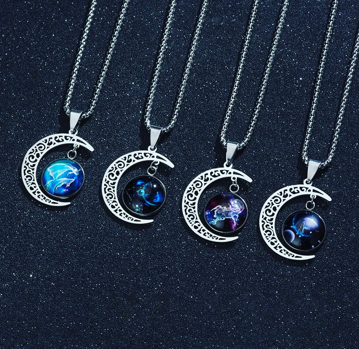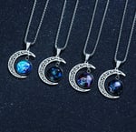 Stainless Steel Zodiac Signs Cabochon Glass Crescent Moon Pendant and Necklace