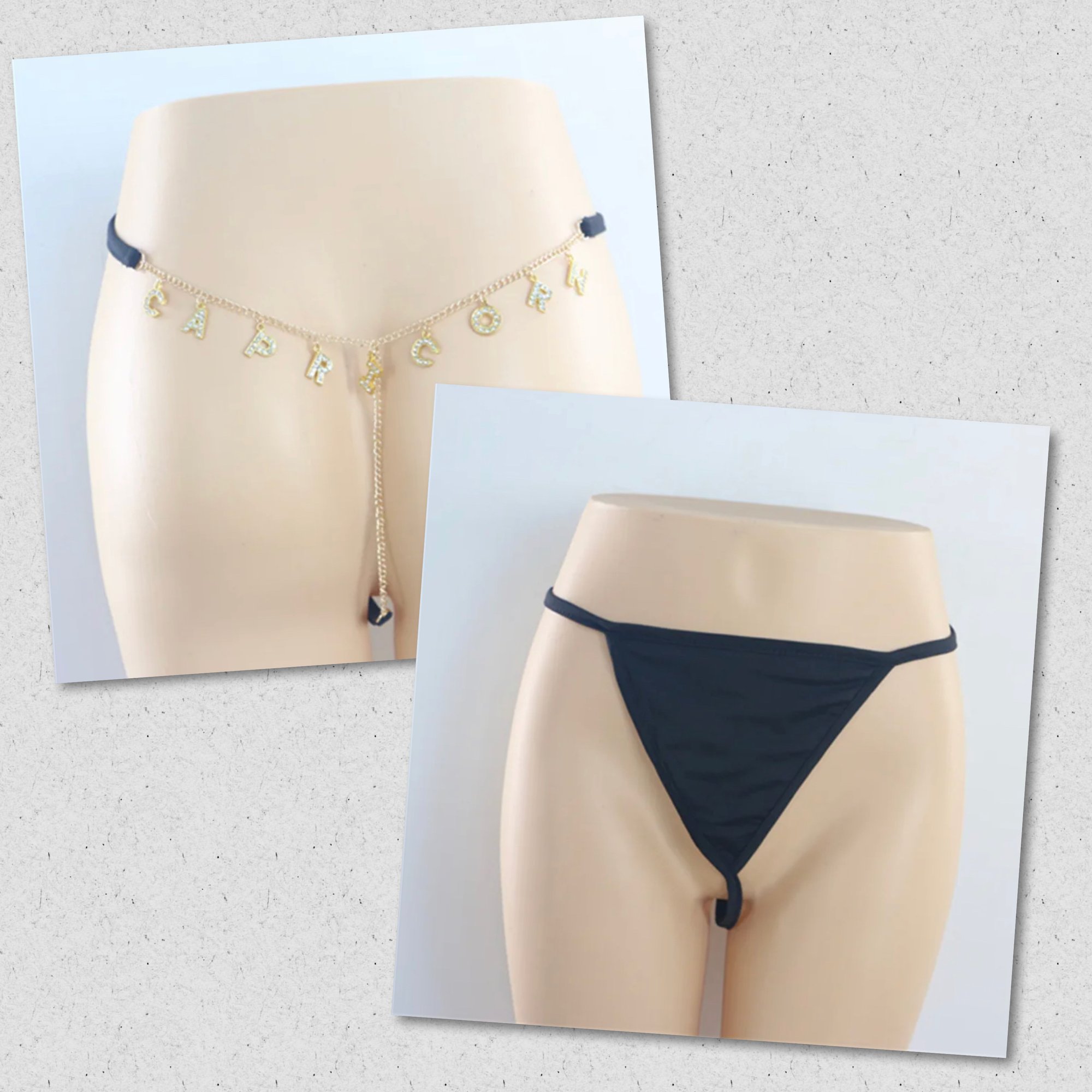 Sexy Women 18K Gold Plated Waist Chain Crystal Rhinestone 12 Zodiac Sign Adjustable Thong Panties (Black & Gold)